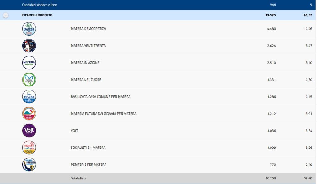 MATERA – Sarà il turno di ballottaggio in programma domenica 8 e lunedì 9 giugno a sancire chi sarà il nuovo sindaco di Matera. Il primo turno ha restituito il risultato più probabile alla vigilia, ovvero quello della sfida decisiva tra Roberto Cifarelli (consigliere regionale Pd candidato però da vincitore delle Primarie dei giovani), sostenuto da nove liste che hanno superato abbondantemente il 50% dei consensi e il candidato del centrodestra, Antonio Nicoletti. Per il primo 13.925 preferenze, pari al 43,52% dei consensi mentre le liste hanno ricevuto 16.258 voti, pari al 52,48%. Per Nicoletti il 36,98% delle preferenze con 11.832 voti totali e le sei liste a sostegno che si fermano a 10.315. Numeri che dimostrano l’ampio ricorso al voto disgiunto. Tra le liste il risultato migliore lo porta a casa Matera Democratica a sostegno di Cifarelli con il 14,46%, mentre nel centrodestra la prima lista è Fratelli d’Italia con il 10,41%. Ora nella prossima settimana bisognerà verificare se ci saranno o meno apparentamenti ufficiali tra i candidati al ballottaggio e le forze politiche rimaste fuori dal secondo turno. Ipotesi già scartata dal sindaco uscente del M5s, Domenico Bennardi che si è fermato all’8,33% delle preferenze con 2.664 voti (per la lista del M5s 1.694 voti pari al 5,47%). Poco più indietro l’ex presidente del Consiglio regionale, Vincenzo Santochirico che ottiene 2.192 voti (6,85%) mentre la lista Progetto Comune a suo sostegno si ferma a 1.857 preferenze (5,99%). Chiude Luca Prisco con 1.381 voti (4,32%) con la lista a suo sostegno Mathera-Democrazia Matera che ottiene 853 preferenze (2,75%). Di seguito il resoconto dei voti di lista a sostegno dei due candidati che vanno al ballottaggio.